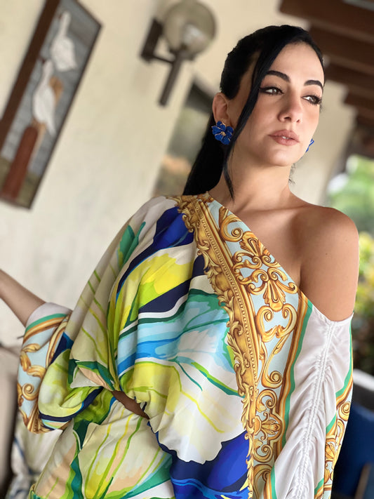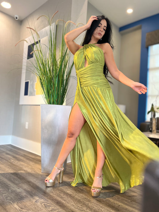 Elevate your evening style with this captivating emerald green ruffle dress. Designed to turn heads, this gown features cascading layers of soft chiffon that create a flowing, romantic silhouette. The delicate lace panel at the waist adds a touch of allure, while the daring thigh-high slit showcases your legs with elegance. Thin, adjustable straps ensure a perfect fit, and the deep V-neckline enhances the feminine allure of the piece. Ideal for special occasions, pair it with bold accessories like the gold clutch and statement earrings for a sophisticated yet sultry look.