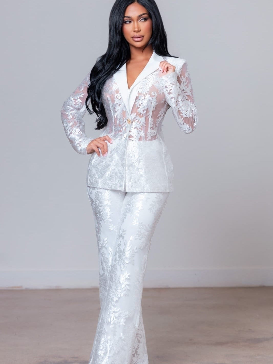 Elevate your wardrobe with the Octavia Blazer Suit, crafted from delicate lace fabric that combines elegance with modern flair. This sophisticated set features a tailored blazer and matching pants, designed to offer a refined silhouette and effortless style. Perfect for occasions where grace meets confidence, the lightweight lace material ensures comfort while making a bold fashion statement. Embrace timeless sophistication with the Octavia Blazer Suit.Nylon lining