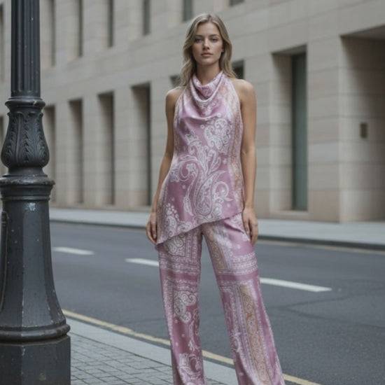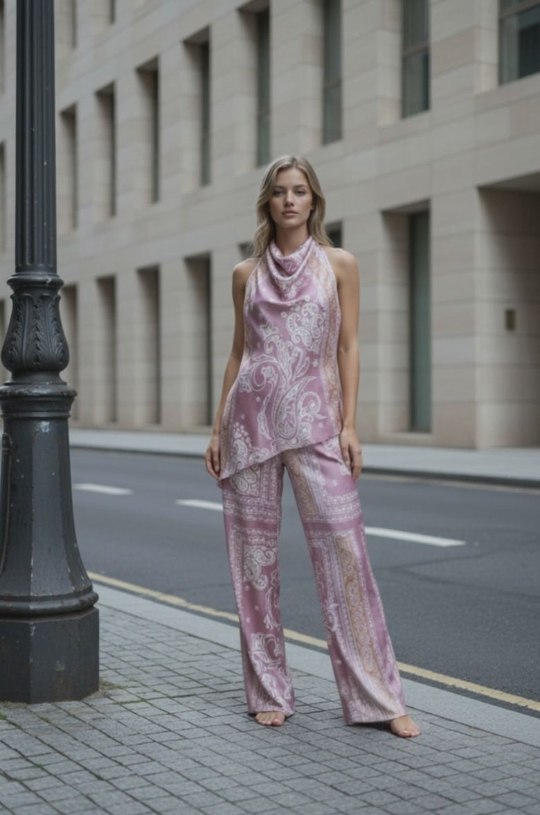 # Pink Palazzo Set Elevate your wardrobe with this luxurious pink palazzo set, crafted from sumptuous satin for a refined, fluid silhouette. The coordinated two-piece design offers effortless sophistication—perfect for evening occasions, upscale gatherings, or elevated everyday wear. The soft drape of satin creates movement and grace with every step, while the palazzo cut provides comfort without compromising style. Available in Small, Medium, and Large to ensure a flattering fit for every frame.